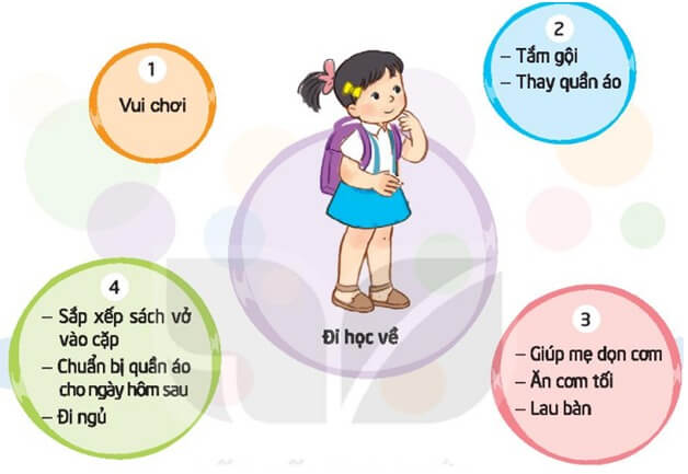 - Nêu tên các hoạt động: Trước khi đi học em đánh răng; sau khi về nhà em chào bố mẹ; sau bữa ăn em giúp mẹ dọn mâm…