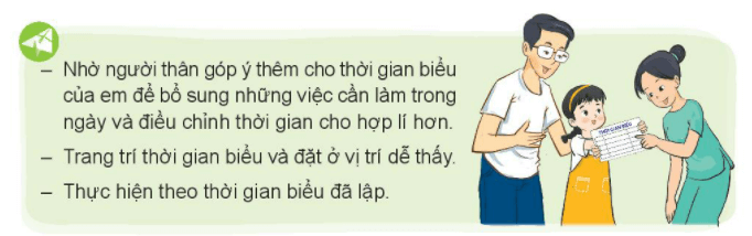 - Em nhờ bố, mẹ, và các thành viên trong gia đình góp ý. Sau đó bổ sung và chỉnh sửa sao cho khớp với lịch trình công việc và lịch sinh hoạt chung của tất cả thành viên trong nhà để mọi hoạt động trong thời gian biểu được thực hiện chính xác và dễ dàng nhất.
