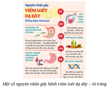 - Biện pháp phòng chống: Để phòng bệnh viêm loét dạ dày – tá tràng cần duy trì chế độ ăn uống hợp lí, nghỉ ngơi và sinh hoạt điều độ, giữ tinh thần thoải mái để phòng chống bệnh.