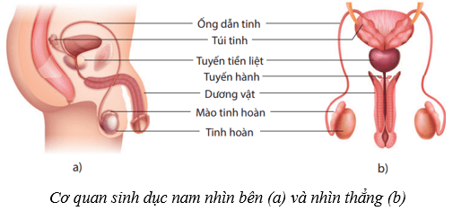 - Cấu tạo của cơ quan sinh dục nam: Cơ quan sinh dục ở nam gồm tinh hoàn nằm trong bìu, mào tinh, ống dẫn tinh, túi tinh, ống đái, dương vật.