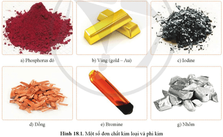 Quan sát hình 18.1, chỉ ra các đơn chất kim loại, các đơn chất phi kim