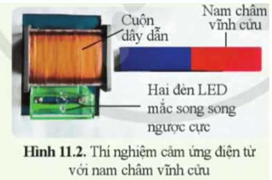 + Đặt nam châm vĩnh cửu và cuộn dây dẫn kín có hai đèn LED nằm yên ở gần nhau (hình 11.2).