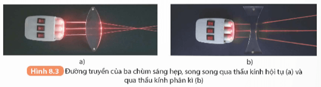 Hãy chỉ ra đâu là trục chính quang tâm tiêu điểm chính của các thấu kính trong Hình 8.3