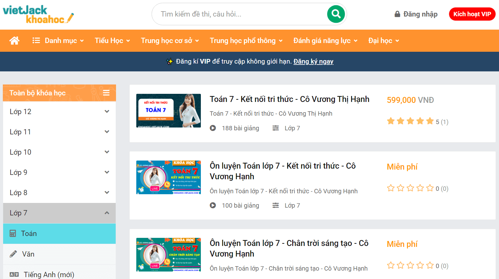 Trên Danh mục, chọn Khóa học → Lớp 7 → Toán