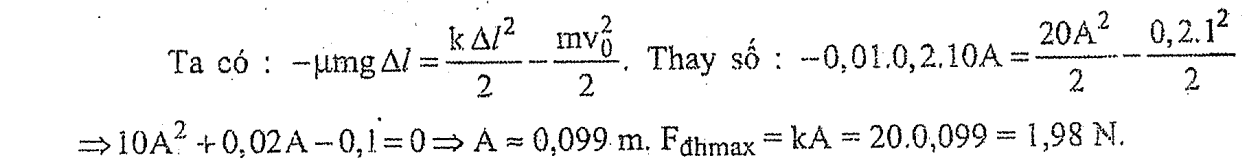 Câu 7: Một con lắc lò xo gồm vật nhỏ khối lượng m=0,2kg, lò xo nhẹ có độ cứng k=20N/m được đặt trên mặt phẳng nằm ngang. Hệ số ma sát trượt giữa vật và mặt phẳng nằm ngang là u=0,01. Từ vị trí lò xo không bị biến dạng, truyền cho vật vận tốc ban đầu có độ lớn vo=1 m/s dọc theo trục lò xo. Con lắc dao động tắt dần trong giới hạn đàn hồi của lò xo. Độ lớn lực đàn hồi cực đại của lò xo trong quá trình dao động bằng