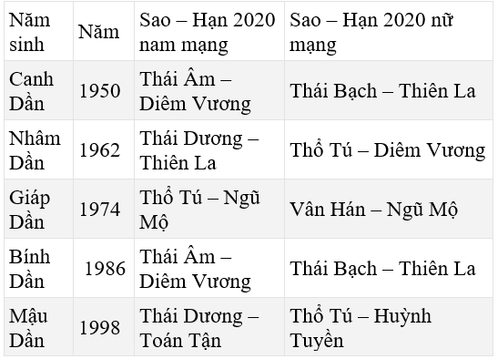 3. Sao hạn 2020 và sao chiếu mệnh năm 2020 tuổi Dần