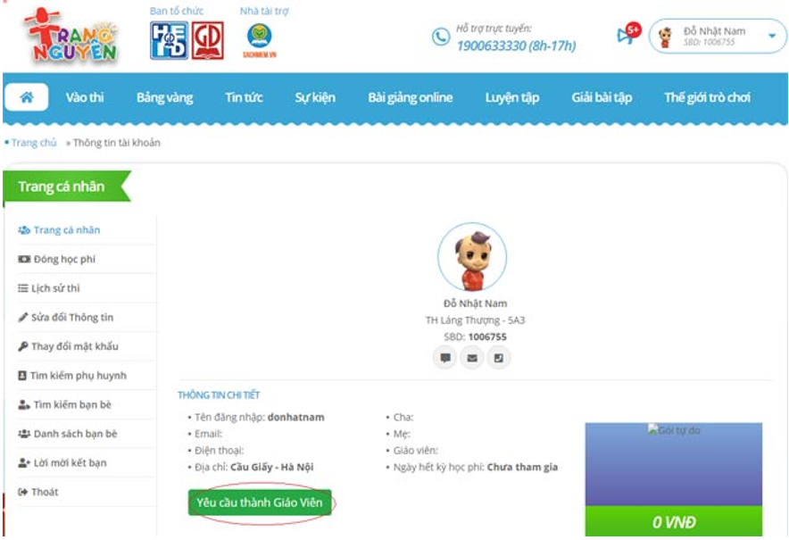Tiếp theo, điền thông tin vào biên bản trong file Excel rồi gửi về email: giaovien@trangnguyen.edu.vn để Ban tổ chức kích hoạt, xác nhận tài khoản. Khi thành giáo viên, tài khoản của bạn sẽ hiển thị dòng chữ "Bạn đang là giáo viên".