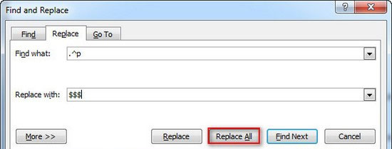 - Nhập vào ô Find what: ký tự xuống dòng ^p.