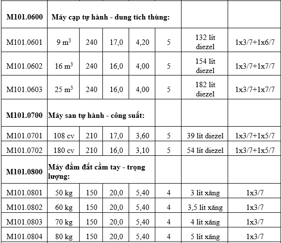 Định mức các hao phí xác định giá ca máy và thiết bị thi công xây dựng gồm 2 chương được trình bày theo nhóm, loại máy và được mã hóa thống nhất bằng mã hiệu.