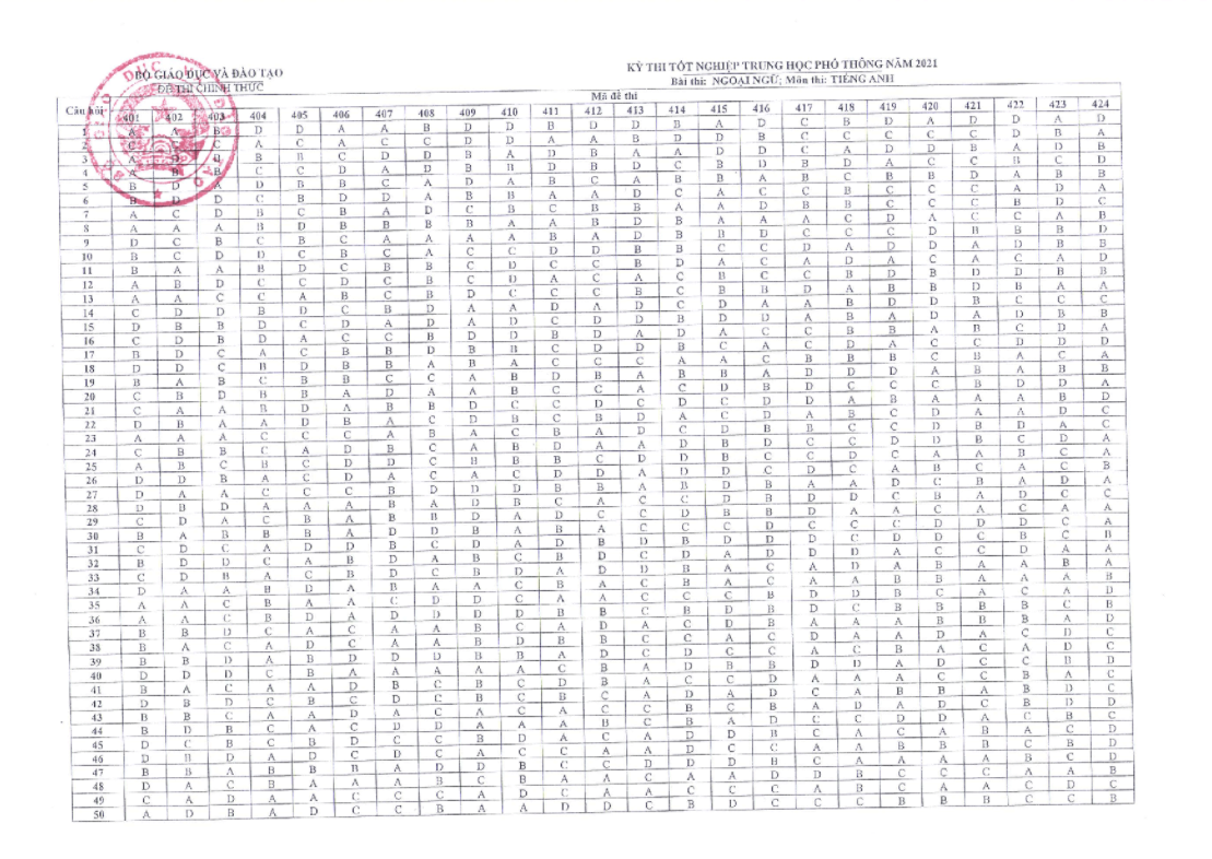 3. Đáp án chính thức môn Tiếng Anh của Bộ năm 2021