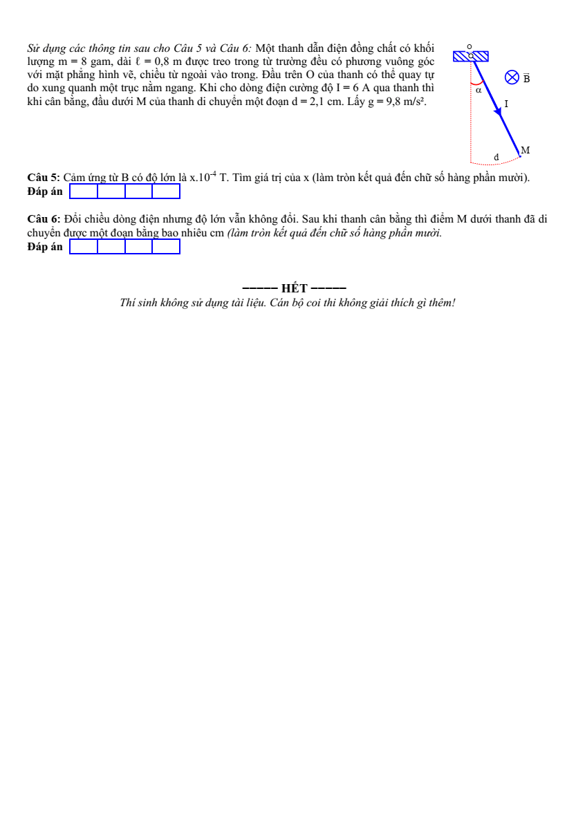 Câu 25. Từ trường cách một dây thẳng dài 40 cm có độ lớn cảm ứng từ là B = 10-6T. Cường độ dòng điện trong dây là bao nhiêu ampe?