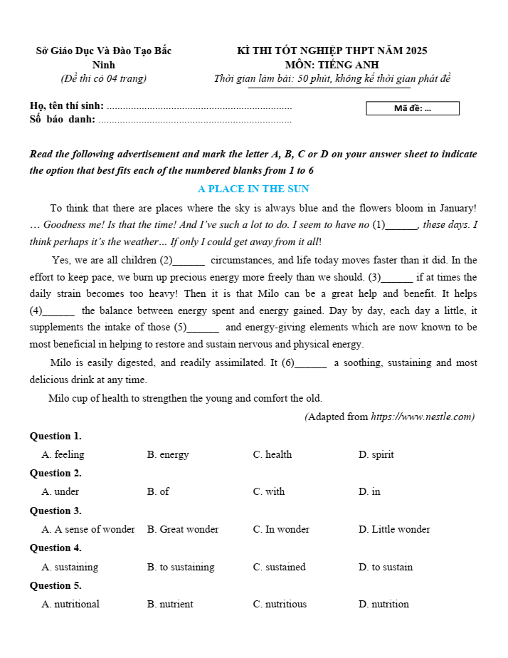 Đề thi thử Tốt nghiệp Tiếng Anh 2025 sở GD&ĐT Bắc Ninh