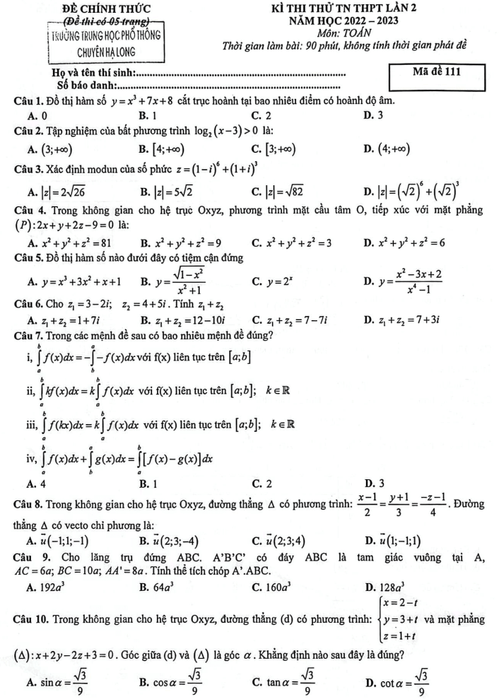 Đề thi thử Toán 2023 lần 2 trường chuyên Hạ Long, Quảng Ninh
