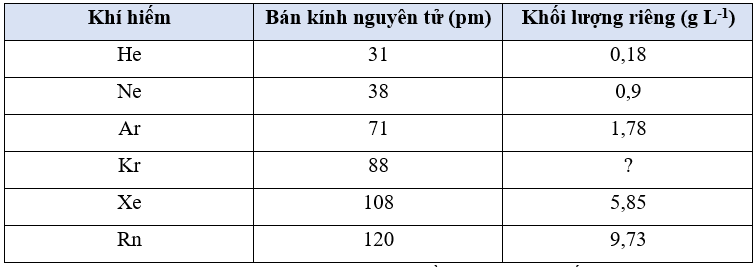 Xem xét số liệu về bán kính nguyên tử và khối lượng riêng của các khí hiếm trong bảng