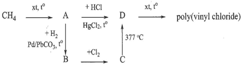 Bài 16.17 trang 60 Sách bài tập Hóa học 11: Dự đoán các chất A, B, C và D trong sơ đồ chuyển hoá điều chế poly(vinyl chloride) sau đây và viết các phương trình hoá học.