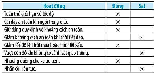 Bài 11.4 trang 34 sách bài tập KHTN 7: Đánh dấu (x) vào cột đúng hoặc sai về phương diện an toàn giao thông cho mỗi hoạt động sau.