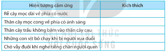 Hoàn thành thông tin trong bảng theo mẫu sau: Hiện tượng cảm ứng; Kích thích