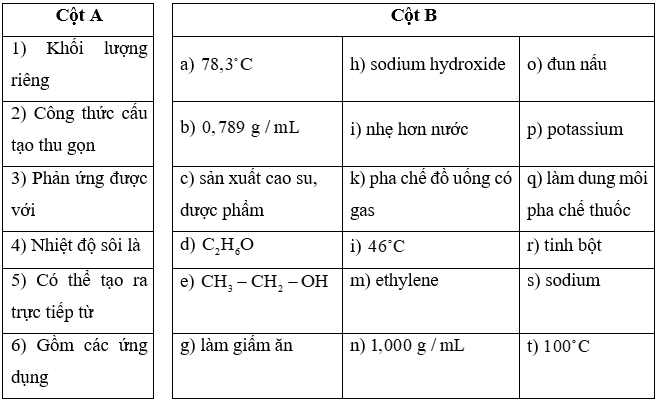 Câu 24.10 trang 65 Sách bài tập KHTN 9: Nối thông tin ở cột A với thông tin ở cột B để được kết quả đúng về ethylic alcohol.
