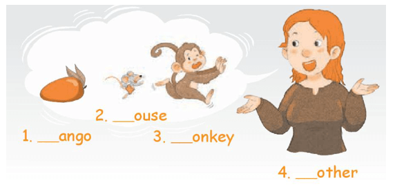7 (trang 33 Sách bài tập Tiếng Anh lớp 1 Global Success): Project: Colour the mango, the monkey, the mop and the mouse. Then point and say aloud. (Dự án: Tô màu quả xoài, con khỉ, cây lau nhà và con chuột. Sau đó chỉ và nói to.)