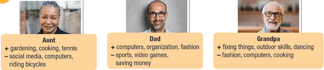 (trang 13 SBT Tiếng Anh 11 Smart World): Look at the people below. Imagine they are your family members. Choose 2-3 things you have or could learn from them and at least one skill or knowledge you could or have shared with them. Give examples or extra opinions for each idea. (Hãy nhìn những người bên dưới. Hãy tưởng tượng họ là thành viên gia đình của bạn. Chọn 2-3 điều bạn có hoặc có thể học được từ họ và ít nhất một kỹ năng hoặc kiến thức bạn có thể hoặc đã chia sẻ với họ. Đưa ra ví dụ hoặc ý kiến thêm cho mỗi ý tưởng.)