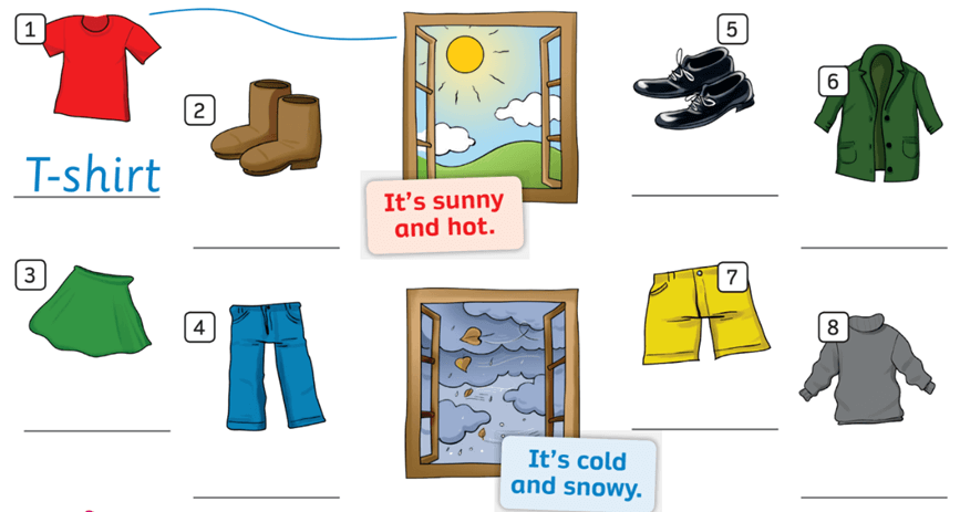 3. Tớ đang mặc một chiếc áo phông màu hồng, váy xanh và giày trắng. Trời ấm và có nắng.