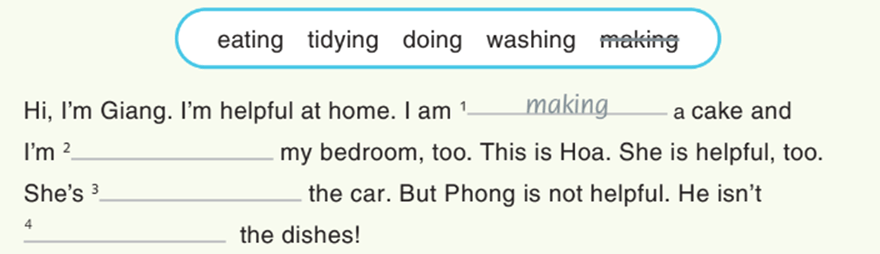 Xin chào, tôi tên là Giang. Tôi rất hay giúp đỡ ở nhà. Tôi đang làm bánh và tôi cũng dọn dẹp phòng ngủ của mình. Đây là Hoa. Cô ấy cũng hay giúp đỡ khi ở nhà. Cô ấy đang rửa xe ô tô. Nhưng Phong không hay giúp đỡ. Anh ta đang không rửa bát!