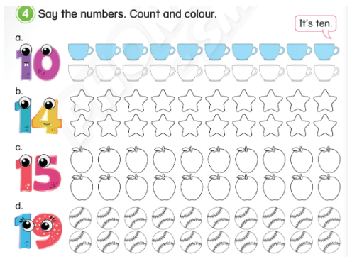 4 (trang 8 sách bài tập Tiếng Anh lớp 3 Phonics Smart): Say the numbers. Count and colour. (Nói những con số. Đếm và tô màu.)