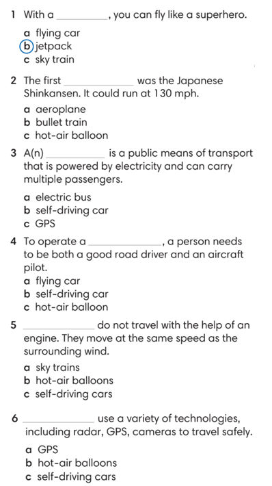 I think in the future there will be many modern means of (1. transport) such as bullet trains, sky trains, self-driving cars. However, my favorite one is a (2). It looks like a normal car, but it has wings and it can fly in the sky. The car will use (3) energy. It catches heat from the sun and generate (4). I think it is a big (5) which is good for (6) and save energy.