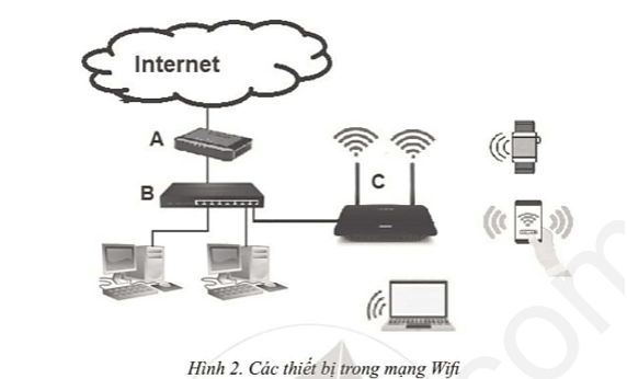 - Acess Point là thiết bị kết nối trung tâm của mạng không dây. Các máy tính trong mạng Wifi dùng sóng điện từ để truyền thông tin cho nhau thông qua Access Point, vì vậy thiết bị C trong Hình 2 là Access Point.