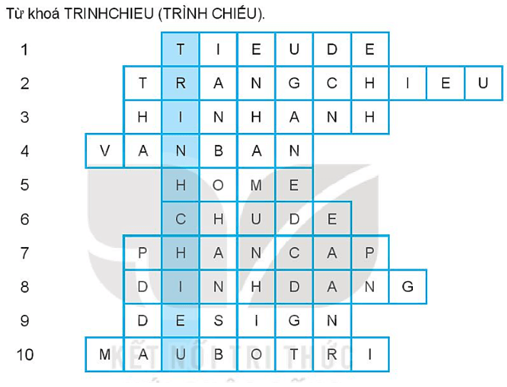 Câu 12.11 trang 45 SBT Tin học 7: Giải ô chữ: Hãy tìm từ khóa trong cột màu xanh của ô chữ dưới đây. Biết rằng mỗi từ hoặc cụm từ trong mỗi hàng là đáp án cho mỗi câu hỏi tương ứng sau: