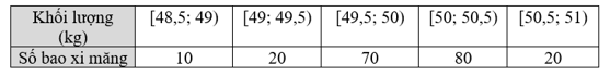 Ta có bảng tần số ghép nhóm cho dữ liệu về khối lượng của 200 bao xi măng là: