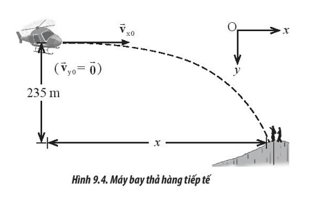 Bài 9.5 (H) trang 28 SBT Vật Lí 10: Một chiếc máy bay muốn thả hàng tiếp tế cho những người leo núi đang bị cô lập. Máy bay đang bay ở độ cao 235 m so với vị trí đứng của người leo núi với tốc độ 250 km/h theo phương ngang (Hình 9.4). Máy bay phải thả hàng tiếp tế ở vị trí cách những người leo núi bao xa để họ có thể nhận được hàng? Lấy g = 9,8 m/s2 và bỏ qua lực cản không khí.
