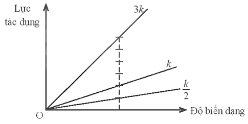 Bài 23.4 (H) trang 81 sách bài tập Vật Lí 10: Hình 23.5 thể hiện đường biểu diễn sự phụ thuộc của lực theo độ biến dạng của một lò xo có độ cứng k. Hãy vẽ trên cùng đồ thị đường biểu diễn sự biến thiên của lực theo độ biến dạng của các lò xo có độ cứng 3k và .