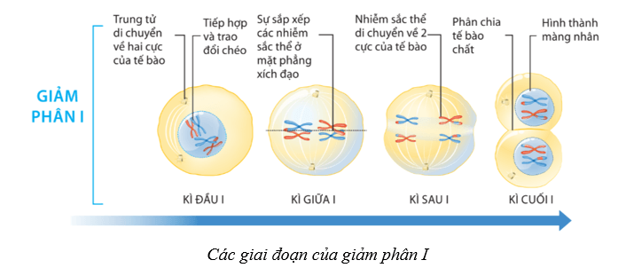 + Giảm phân I: Giai đoạn phân chia thứ nhất của giảm phân làm giảm số lượng nhiễm sắc thể đi một nửa và tạo ra các tổ hợp nhiễm sắc thể mới. Đây là giai đoạn diễn ra sự phân li của các cặp nhiễm sắc thể tương đồng khác nhau và tổ hợp các nhiễm sắc thể không tương đồng.