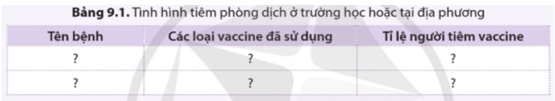 • Học sinh tiến hành điều tra thực trạng tiêm phòng dịch ở trường học và địa phương để hoàn thành bảng 9.1.