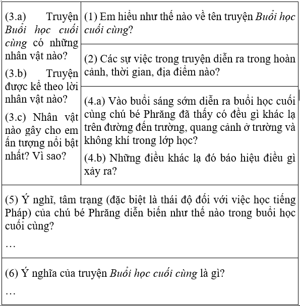 (5) Ý nghĩ, tâm trạng (đặc biệt là thái độ đối với việc học tiếng Pháp) của chú bé Phrăng trong buổi học cuối: - Choáng váng, sững sờ khi nghe thầy thông báo đó là buổi học cuối. - Khi không thuộc bài, Phrăng rất ân hận. Sự ân hận chuyển thành nỗi xấu hổ, tự giận mình. - Thấy bài giảng của thầy dễ hiểu, yêu người thầy nghiêm khắc Ha- men. |
