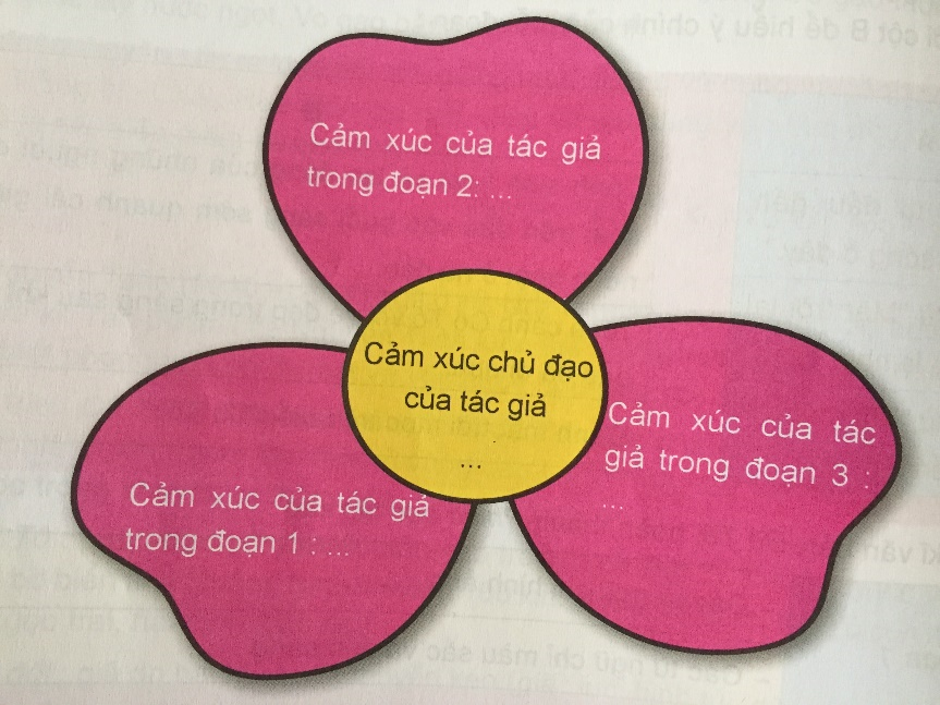 Câu e (trang 68 sgk Ngữ văn 6 tập 2 VNEN). Hoàn thành sơ đồ sau để tìm hiểu cảm xúc của tác giả.