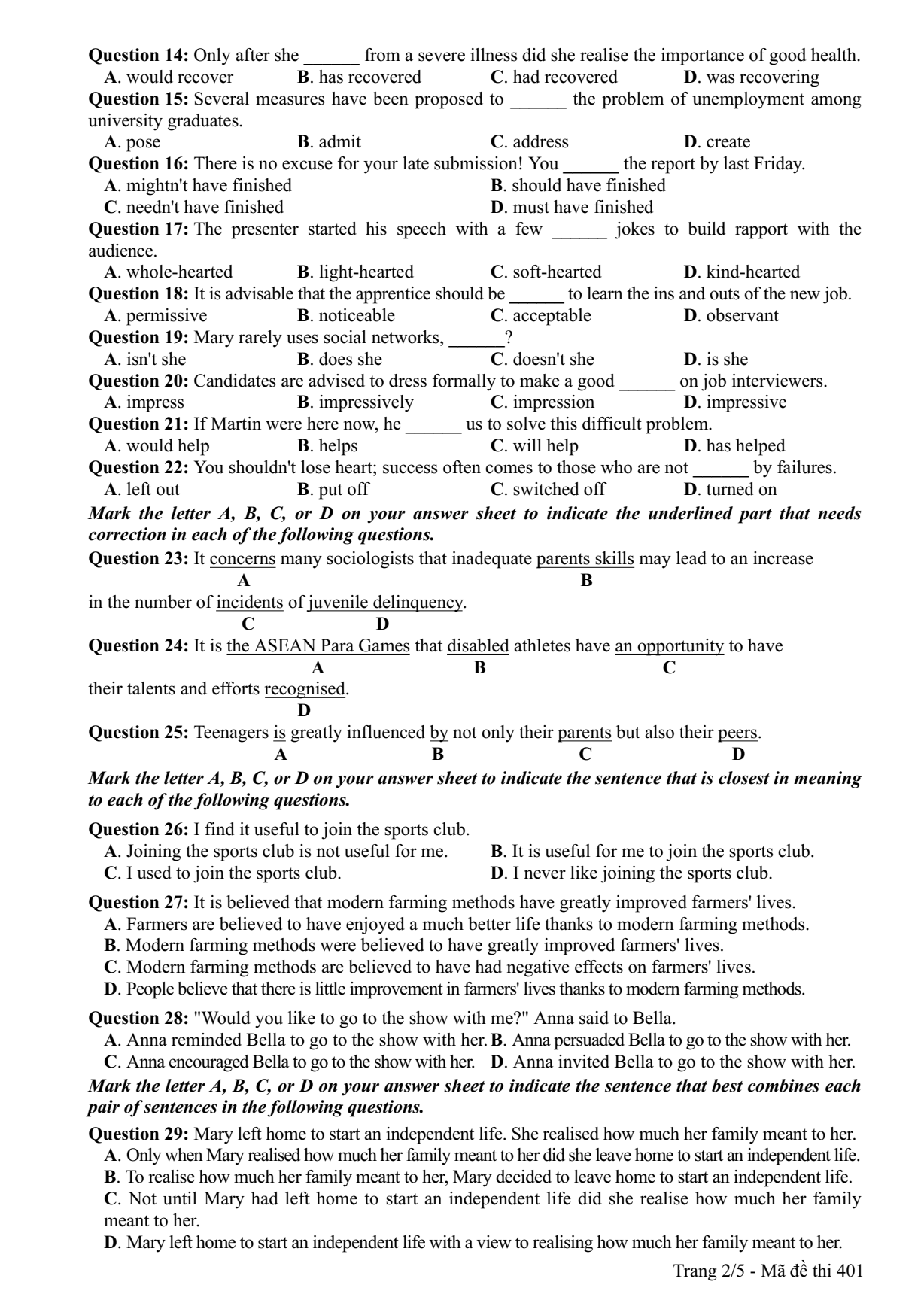 IV. Đề thi THPTQG tiếng Anh năm 2020 – mã đề 401