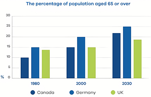 The chart shows the percentages of the population aged 65 and over in Canada, Germany, and the UK, in 1980, 2000, and projected figures for 2030.
