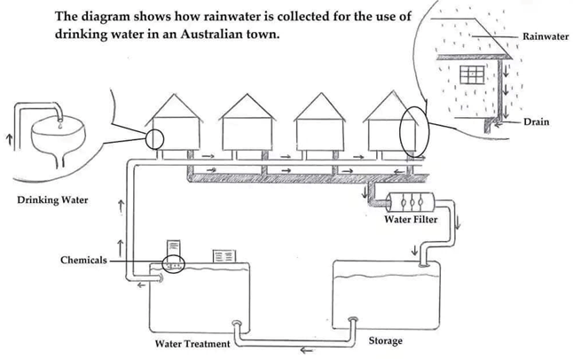 Đề bài: The diagram shows how rainwater is collected for the use of drinking water in an Australian town. Summarise the information by selecting and reporting the main features of the graph and make comparisons where relevant. Write at least 150 words