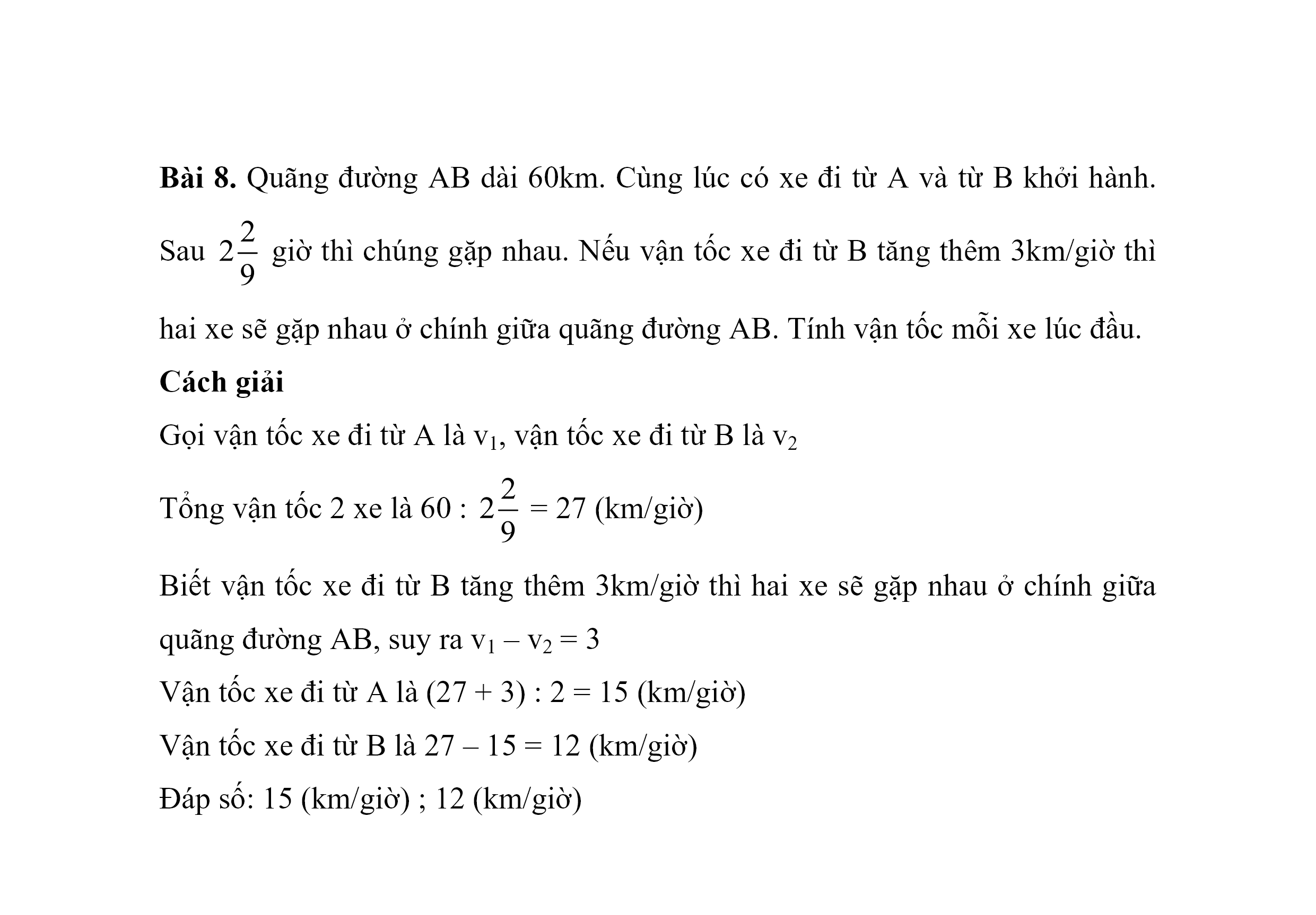 Bài 8. Quãng đường AB dài 60km. Cùng lúc có xe đi từ A và từ B khởi hành. Sau giờ thì chúng gặp nhau. Nếu vận tốc xe đi từ B tăng thêm 3km/giờ thì hai xe sẽ gặp nhau ở chính giữa quãng đường AB. Tính vận tốc mỗi xe lúc đầu.