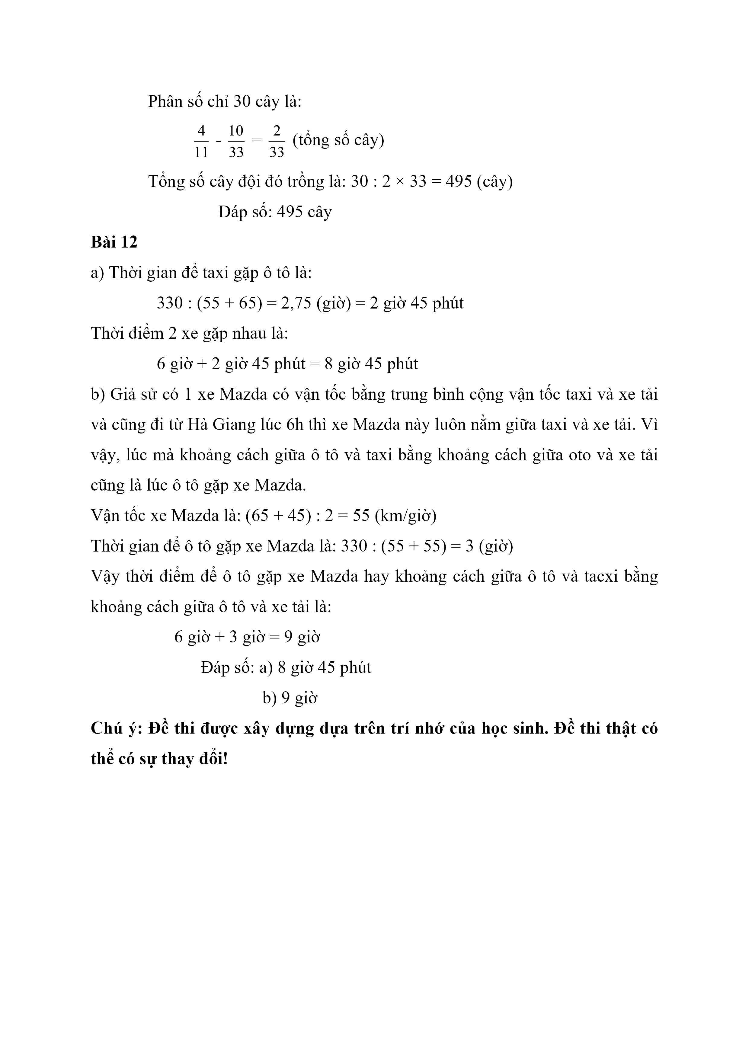 Bài 12. Đoạn đường từ Hà Nội đến Hà Giang dài 330km. Một ô tô xuất phát từ Hà Nội lúc 6 giờ với vận tốc 55km/giờ. Cùng lúc 2 xe ta xi và xe tải xuất phát từ Hà Giang với vận tốc 65km/giờ và 45km/giờ.