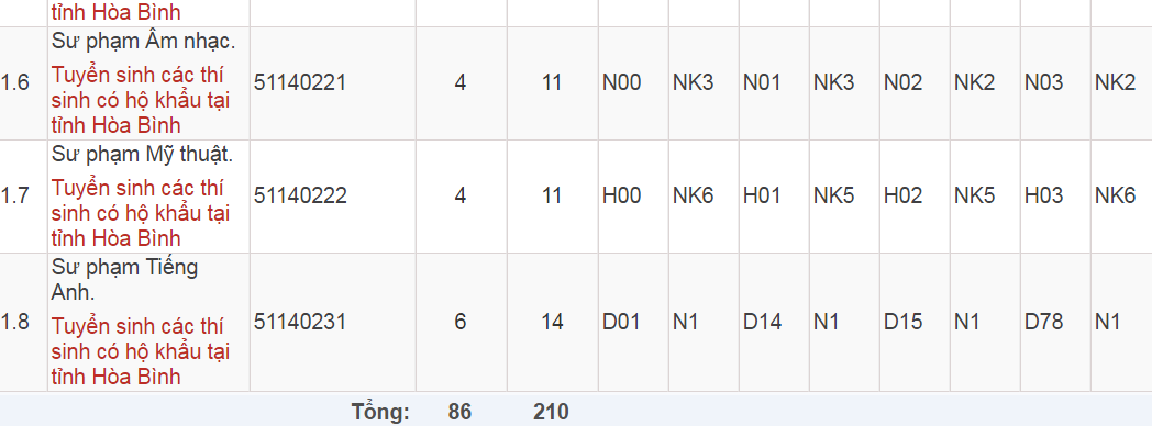 + Các ngành Sư phạm: Tuyển sinh các thí sinh có hộ khẩu tại tỉnh Hòa Bình.