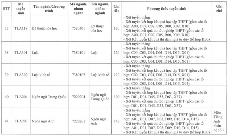 - Phương thức 4: Xét tuyển dựa vào kết quả thi đánh giá tư duy gồm các ngành: