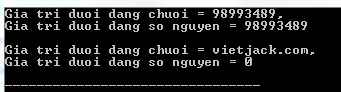 printf("\nGia tri duoi dang chuoi = %s, \nGia tri duoi dang so nguyen = %d\n", str, val);