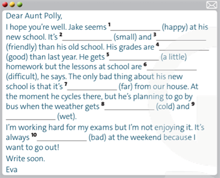 2 (trang 114 Tiếng Anh 10 Friends Global): Complete the email with the comparative form of the adjectives and quantifiers in brackets. (Hoàn thành email với dạng so sánh của các tính từ và từ chỉ định lượng trong ngoặc)