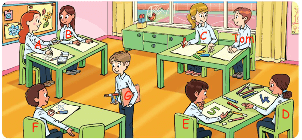 Hướng dẫn: Sẽ có 4 cuộc hội thoại giữa các bạn (A – B), (C – Tom), ( D – E), (F – G), con hãy nghe và chỉ vào từng nhân vật theo gợi ý dưới đây.