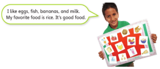 Tớ thích trứng, cá, chuối và sữa. Đồ ăn ưa thích của tớ là cơm. Nó là thức ăn có lợi cho sức khỏe
