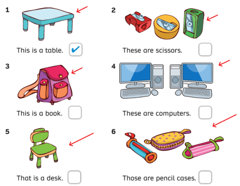 1 (trang 38 sgk Tiếng Anh lớp 3 English Discovery): Look and read. Put a tick (V) or a cross (X) in the box (Nhìn và đọc. Đánh dấu (V) hoặc dấu chéo (X) vào ô)