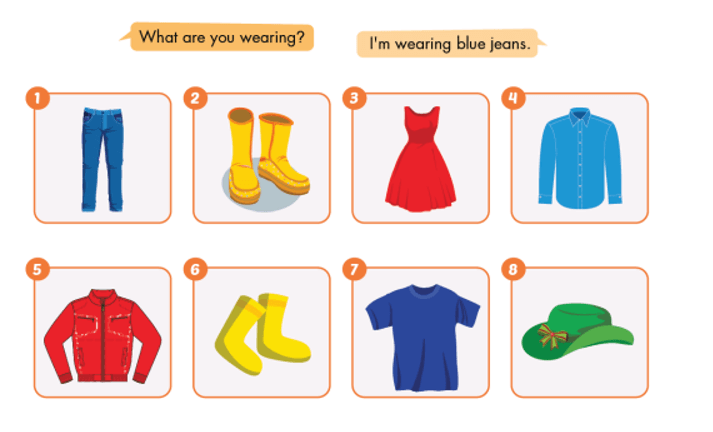 2. Bạn đang mặc gì vậy? – Tôi đang mặc áo khoác màu vàng